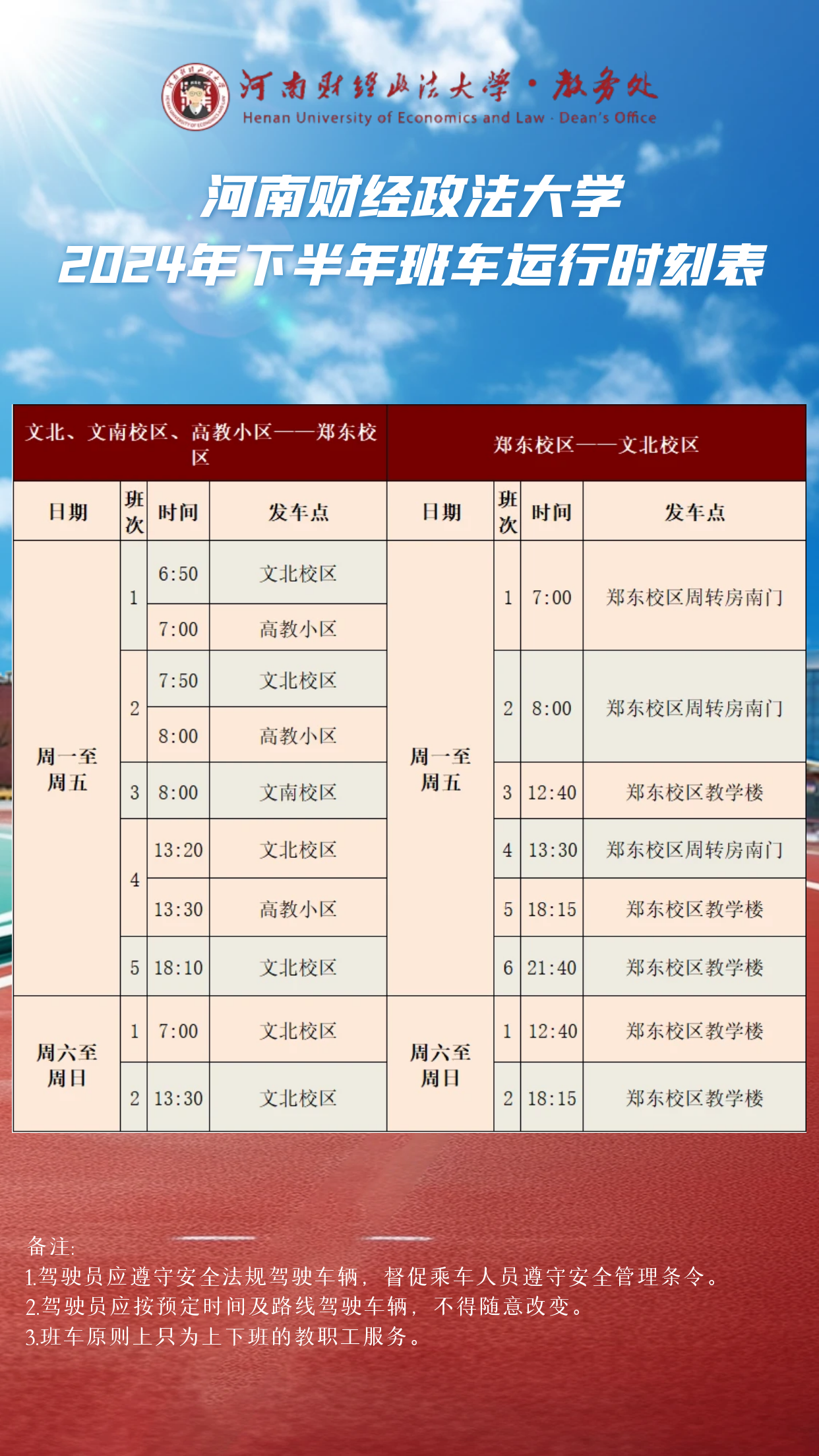 河南财经政法大学2024年下半年班车运行时刻表