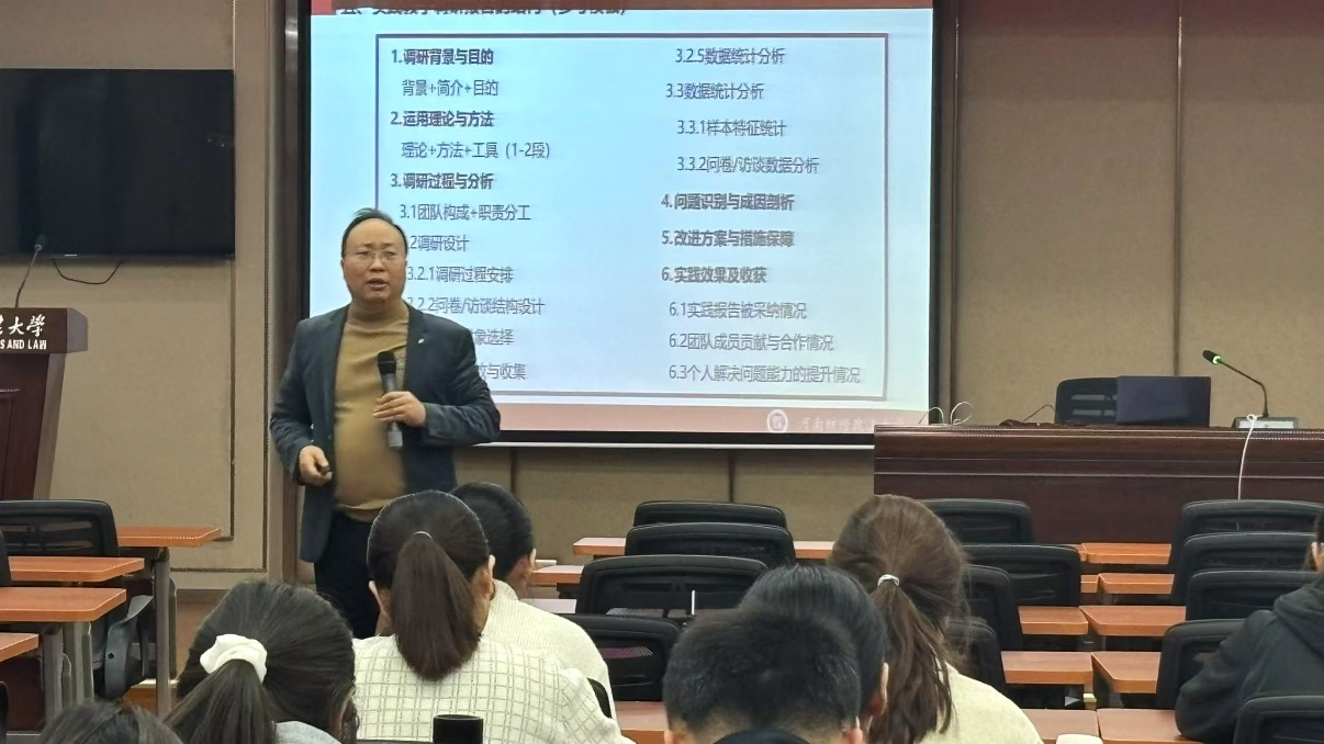本次讲座由黄河商学院的张保仓副教授和骆长琴副教授共同主讲。张保仓从选题构思到数据收集、分析,再到报告撰写的全过程,深入浅出地讲解了调研报告撰写的要点。骆长琴则对实践教学工作安排进行了全面介绍。她明确了各个阶段的任务和时间节点,包括实践项目的选择、实施计划的制定以及最终实践报告的提交要求等。学员们认真聆听,不时记录关键要点,与老师们积极互动,现场气氛热烈。