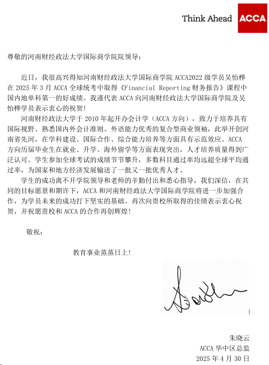 近日,ACCA华中区总部发来贺信,祝贺久久久久亚洲AV手机播放国际商学院ACCA方向班2022级吴怡桦同学在2025年3月英国特许公认会计师公会(ACCA)全球统考中获得《Financial Reporting财务报告》课程中国内地单科第一。