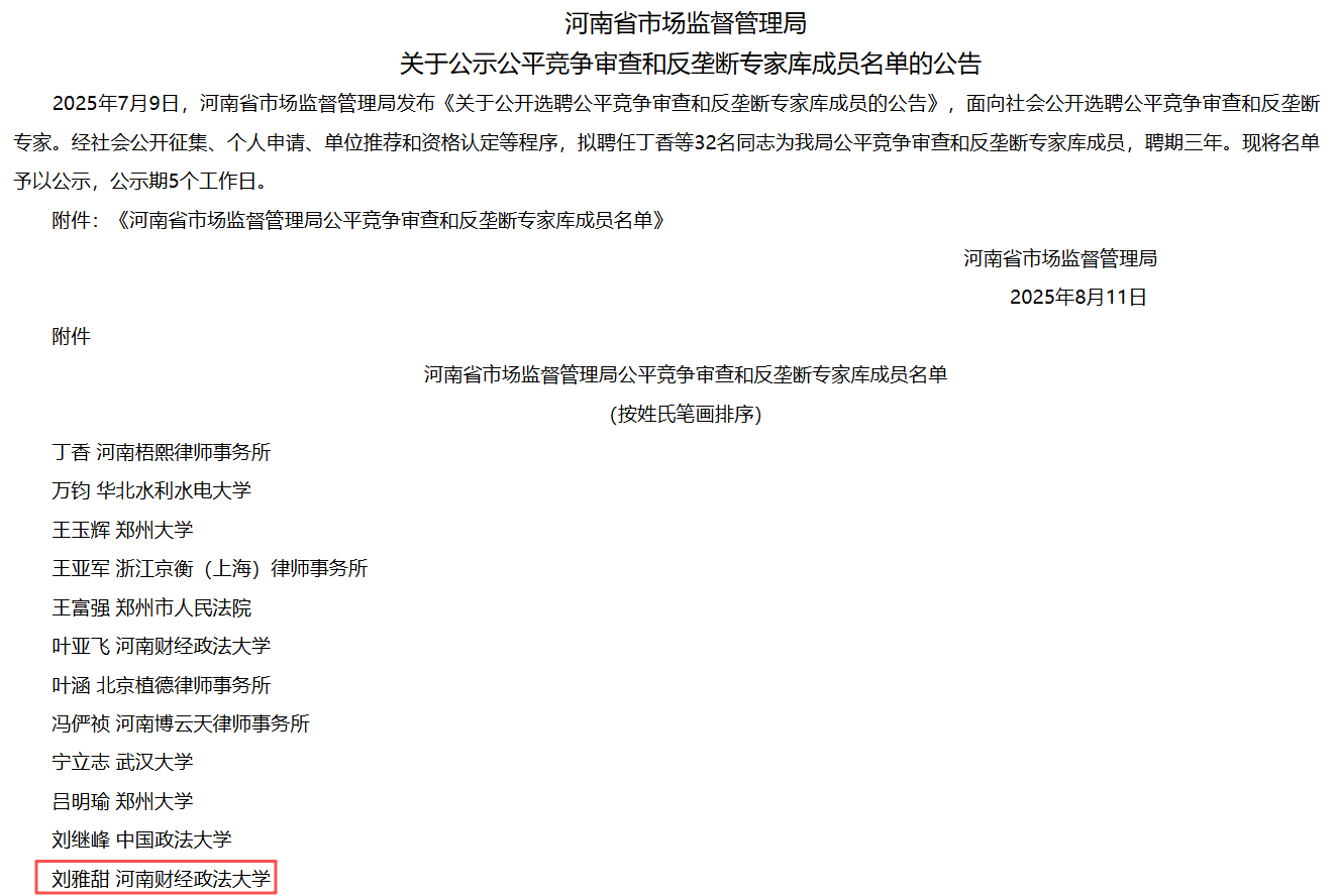 8月11日,河南省市场监督管理局发布《关于公开选聘公平竞争审查和反垄断专家库成员的公告》,我校久久久久亚洲AV手机播放工商管理学院刘雅甜老师凭借专业能力成功入选,获聘该专家库成员,聘期为三年。