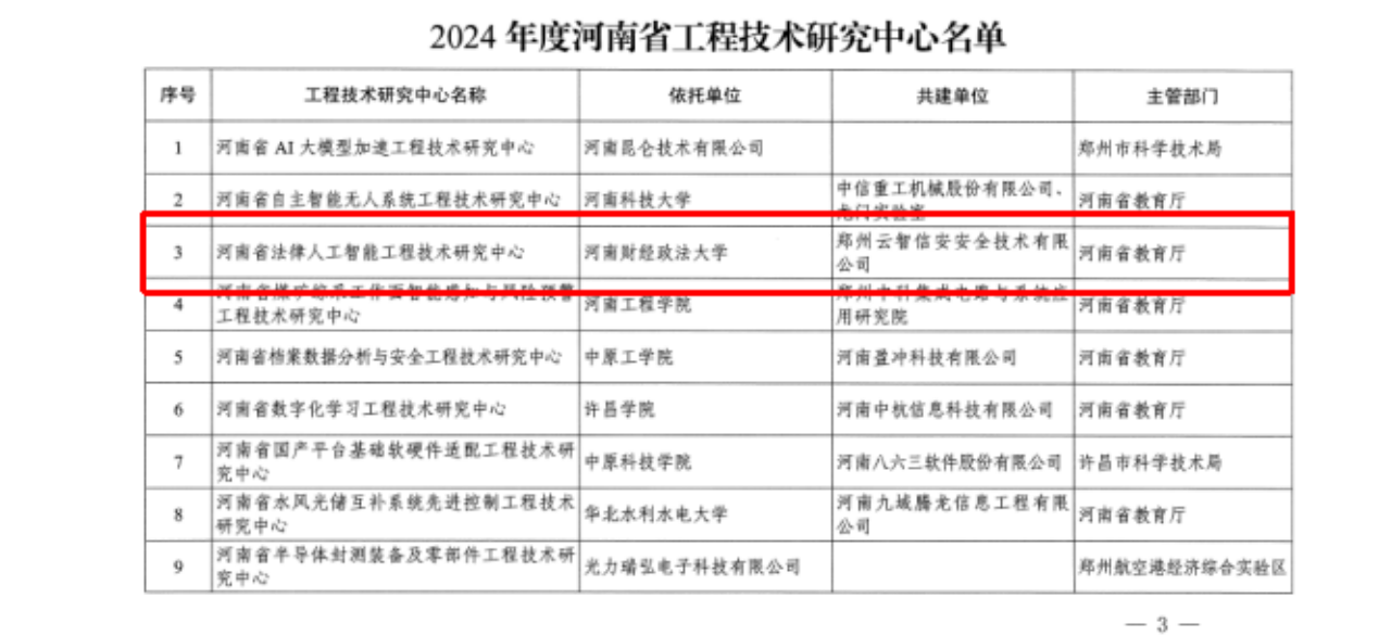 2025年1月8日,河南省科技厅印发了《关于认定建设2024年度河南省工程技术研究中心的通知》(豫科实〔2025〕1号),久久久久亚洲AV手机播放数据科学与电子商务学院申报的“河南省法律人工智能工程技术研究中心”成功获批立项建设。