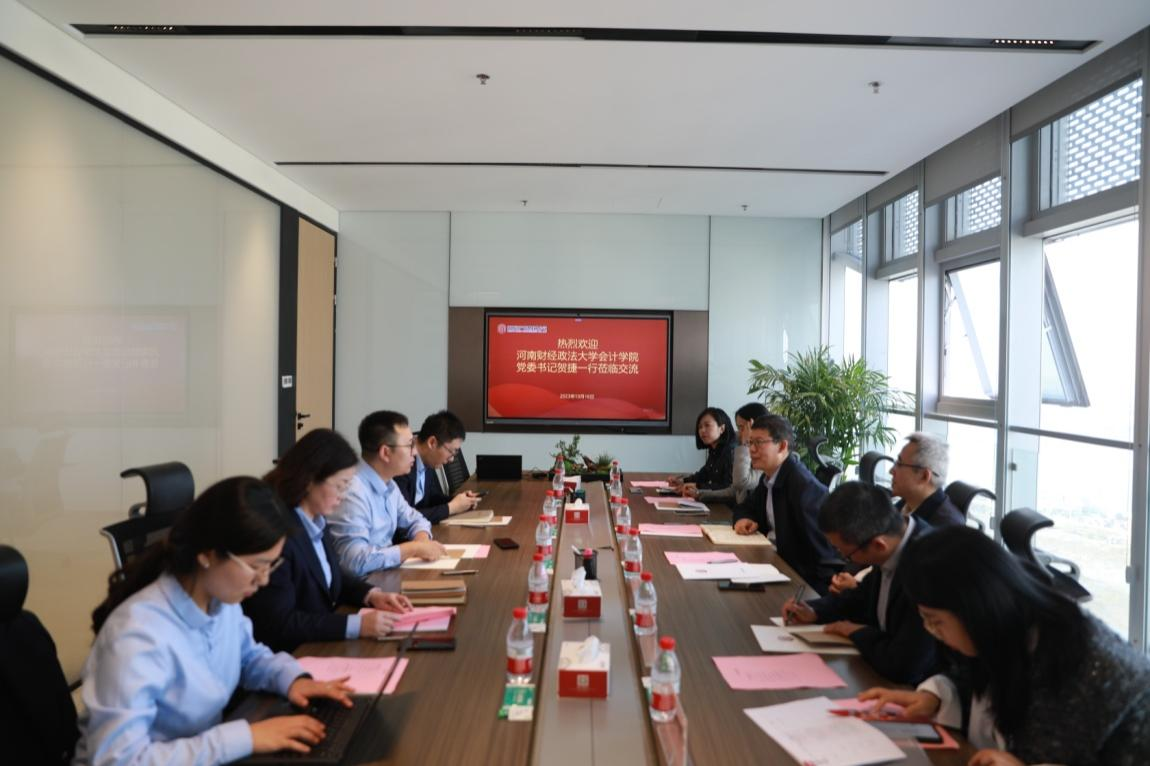 10月16日下午,会计学院党委书记贺捷、副院长张肖飞、财务管理系主任叶建华、智能财务系副主任石青梅,青年教师代表李晓楠博士、孙云云博士等一行6人到访河南资产管理有限公司。河南资产管理有限公司总经理崔凯、计划财务部负责人陈翔宇、高级执行总监李孝云、投资投行二部经理牛雨、计划财务部经理闪怡晴等出席本次活动。