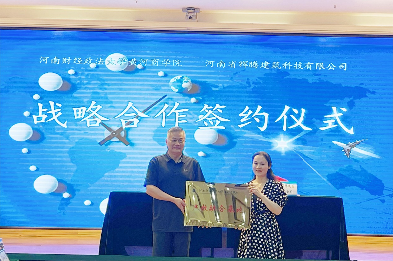 MBA2014级优秀校友、河南省辉腾建筑科技有限公司董事长李晓丽致辞。她对学院师生一行表示热烈欢迎。她详细介绍了公司发展情况,希望与学院加强战略合作,建立长效合作机制,多渠道开展深度融合,拓宽毕业生就业渠道,为母校人才培养及拓岗就业贡献力量。随后,黄河商学院与河南省辉腾建筑科技有限公司签订战略合作协议书,并为其颁授产教融合基地牌匾。
