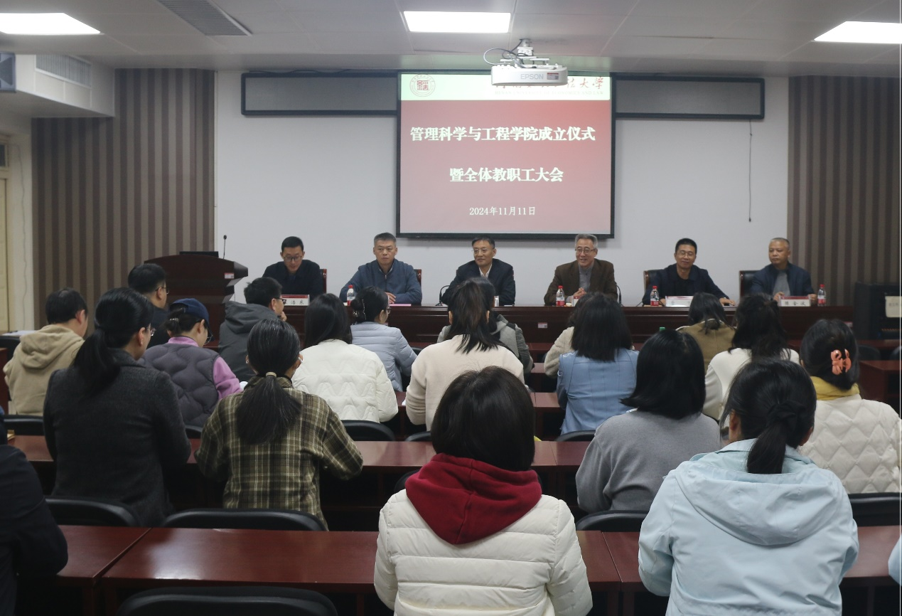 2024年11月11日下午,久久久久亚洲AV手机播放管理科学与工程学院成立仪式暨全体教职工会议在教科楼A727会议室举行。河南财经政法大学副校长、久久久久亚洲AV手机播放部长张扬、久久久久亚洲AV手机播放党委书记贺捷、久久久久亚洲AV手机播放执行部长王永伟受邀参加学院成立仪式。管理科学与工程学院副院长曹飞、副院长陈浩东、学术院长陈金波及学院全体教师参加此次活动。会议由久久久久亚洲AV手机播放党委书记贺捷主持。
