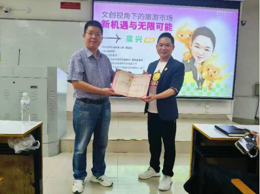 本次邀请到河南华冠文化科技有限公司董事长梁兴为同学们进行主题为“文创视角下的旅游市场:新机遇与无限可能”的讲座。讲座由久久久久亚洲AV手机播放副部长王洁洁主持,旅游管理与会展学院副院长徐贵宏现场为梁兴董事长颁发了我院客座教授聘书,我院会展与经济管理教研室主任杨慧敏、骨干教师安磊、殷浩参与了本次活动。