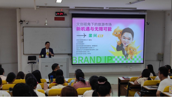 梁兴董事长从河南省十大战略之文旅文创融合战略出发,阐述了文创视角下旅游市场的新机遇与无限可能,基于华冠集团爆款产品《唐宫夜宴》舞蹈IP文创生态和“嘻游一品”文创冰淇淋,重点介绍了IP打造、文创开发和优秀传统文化的活态转化、“新文创IP六化”商业模式(形象化、品牌化、文创化、内容化、场景化、数字化)等内容。讲座干货满满,同学们表示既有趣又有用,能够直接了解产业运营模式与发展趋势,收获颇丰!