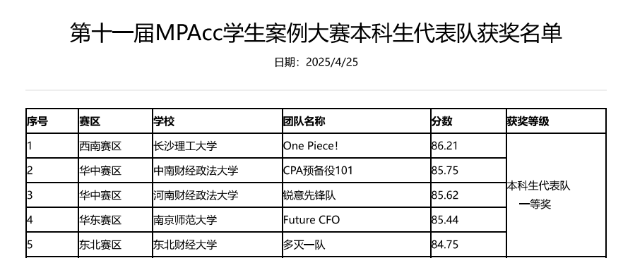 针对MPACC案例大赛,会计学院提前数月组织专项培训、模拟答辩、导师一对一指导,并邀请业界专家与往届获奖团队分享经验,为学生提供全方位备赛支持。会计学院始终秉持“知行合一、产教融合”的教育理念,将学科竞赛作为提升学生专业实践能力的重要抓手,切实推动人才培养模式创新,为社会输送兼具理论素养与实践能力的复合型人才。