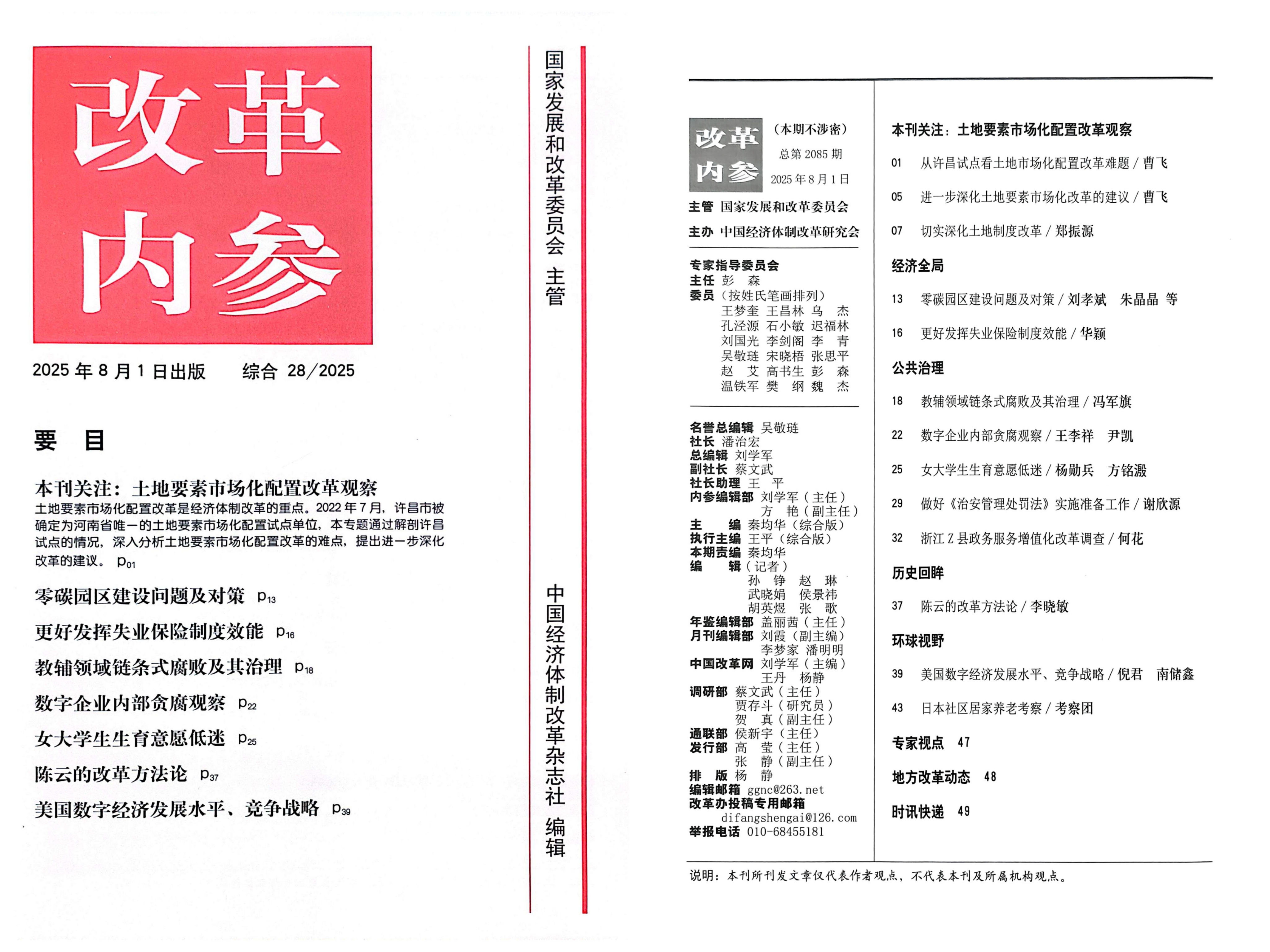 近日,《改革内参》(2025年8月1日版)刊发了久久久久亚洲AV手机播放管理科学与工程学院曹飞的两篇独立署名研究报告——《从许昌试点看土地市场化配置改革难题》与《进一步深化土地要素市场化改革的建议》,相关成果被纳入该刊"土地要素市场化配置改革观察"重点专题。